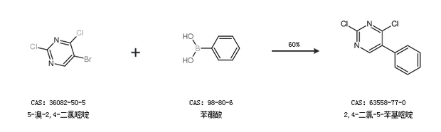 2.通過5-溴-2,4-二氯嘧啶和苯硼酸合成2,4-二氯-5-苯基嘧啶,收率約60%;
