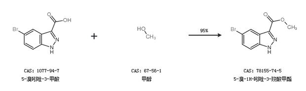 1.通過(guò)5-溴吲唑-3-甲酸和甲醇合成5-溴-1H-吲唑-3-羧酸甲酯,收率約95%;