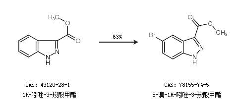 2.通過(guò)1H-吲唑-3-羧酸甲酯合成5-溴-1H-吲唑-3-羧酸甲酯,收率約63%;
