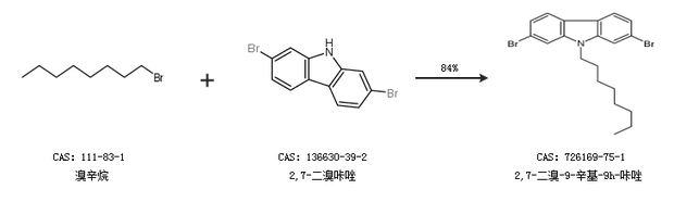 1.通過(guò)溴辛烷和2,7-二溴咔唑合成2,7-二溴-9-辛基-9h-咔唑,收率約84%;