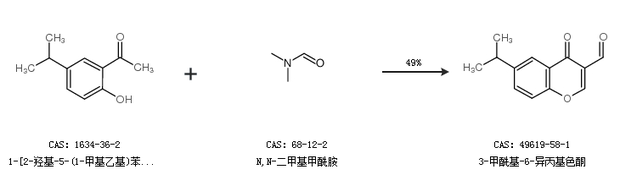 1.通過1-[2-羥基-5-(1-甲基乙基)苯基]乙酮和N,N-二甲基甲酰胺合成3-甲?;?6-異丙基色酮,收率約49%;