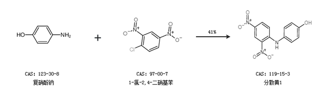 2.通過(guò)復(fù)硝酚鈉和1-氯-2,4-二硝基苯合成分散黃1,收率約41%;