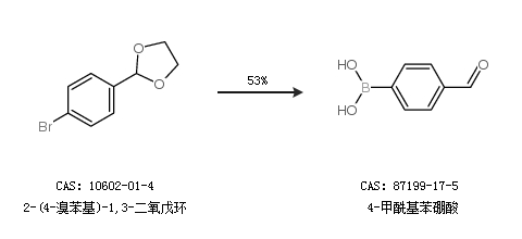 2.通過2-(4-溴苯基)-1,3-二氧戊環(huán)合成4-甲?;脚鹚?,收率約53%;
