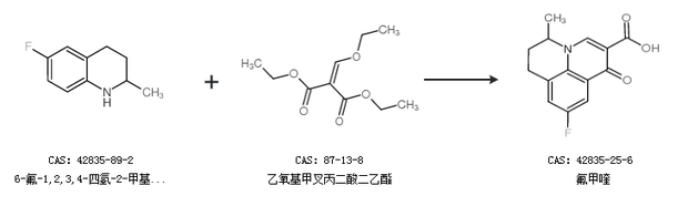 1.通過(guò)6-氟-1,2,3,4-四氫-2-甲基喹啉和乙氧基甲叉丙二酸二乙酯合成氟甲喹