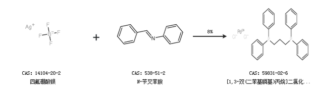 1.通過四氟硼酸銀和N-芐叉苯胺合成[1,3-雙(二苯基膦基)丙烷]二氯化鈀(II),收率約8%;