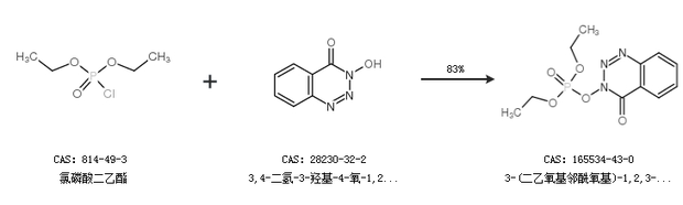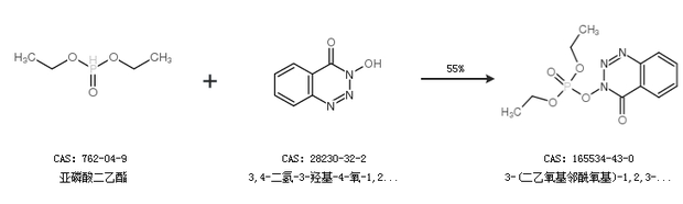 1.通過(guò)氯磷酸二乙酯和3,4-二氫-3-羥基-4-氧-1,2,3-苯并三嗪合成3-(二乙氧基鄰酰氧基)-1,2,3-苯并三嗪-4-酮,收率約83%;