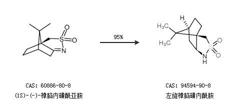 1.通過(1S)-(-)-樟腦內(nèi)磺酰亞胺合成左旋樟腦磺內(nèi)酰胺,收率約95%;