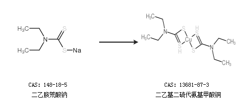 1.通過乙酸銅和二乙胺合成二乙基二硫代氨基甲酸銅,收率約95%;