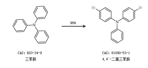 1.通過(guò)三苯胺合成4,4''-二溴三苯胺,收率約98%;
